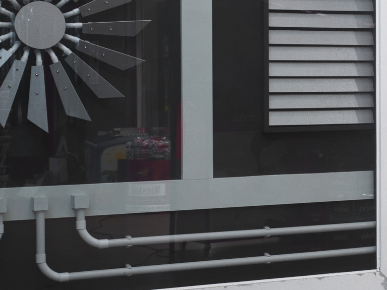 Plywood, electrical piping, paint; 2 x (1900 x 1600 x 40 cm); S-Bahnhof Bilk, Düsseldorf, 2010